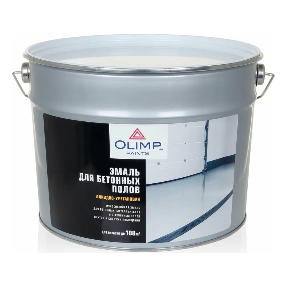 Эмаль для бетонных полов OLIMP (серая; 9 л) 15989 предназначена для бетонных, металлических и деревянных полов внутри и снаружи помещений, в том числе помещений с высокими эксплуатационными нагрузками (гаражи, автомастерские, складские комплексы, торговые залы).
