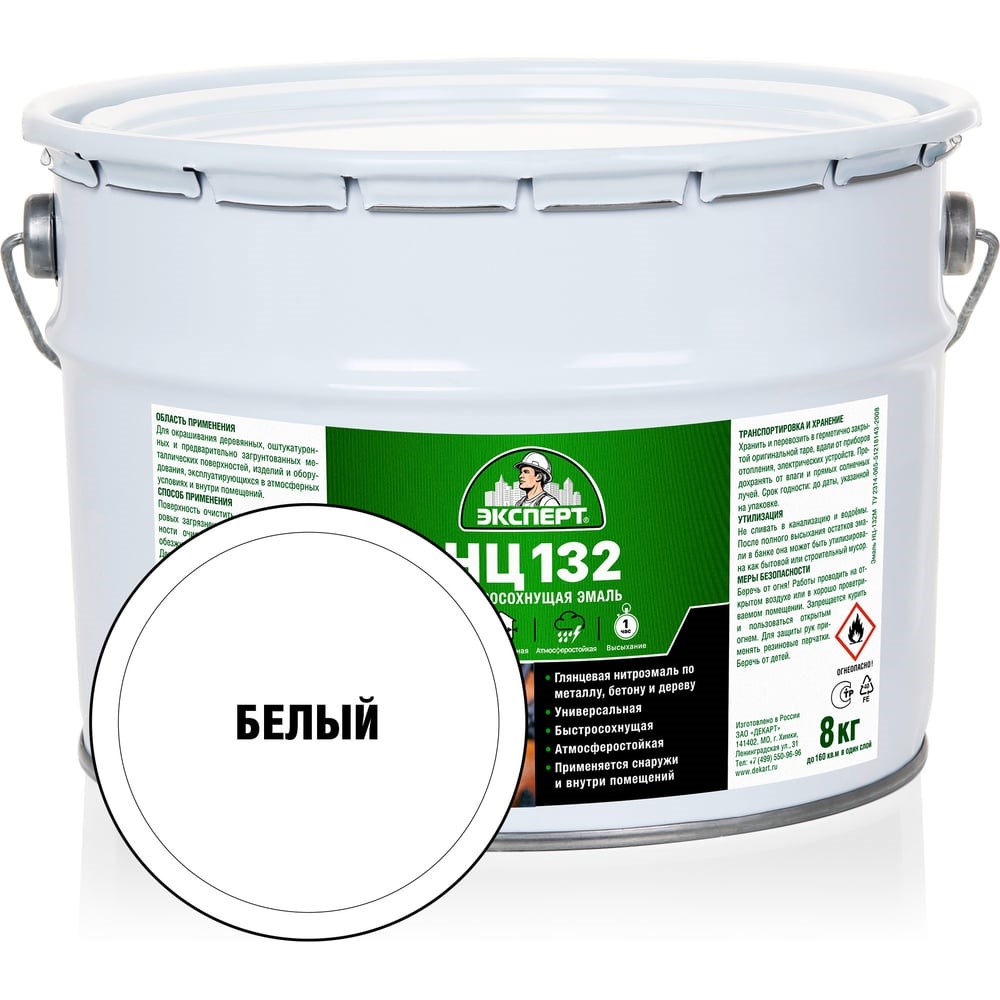 Эмаль Эксперт НЦ-132 белая, 8 кг 22598 применяется для окрашивания деревянных, оштукатуренных и металлических поверхностей, изделий и оборудования снаружи и внутри помещений. Благодаря составу, продукт образует атмосферостойкое, глянцевое покрытие. При температуре воздуха от 18 до 22 градусов время высыхания каждого слоя 1 час.