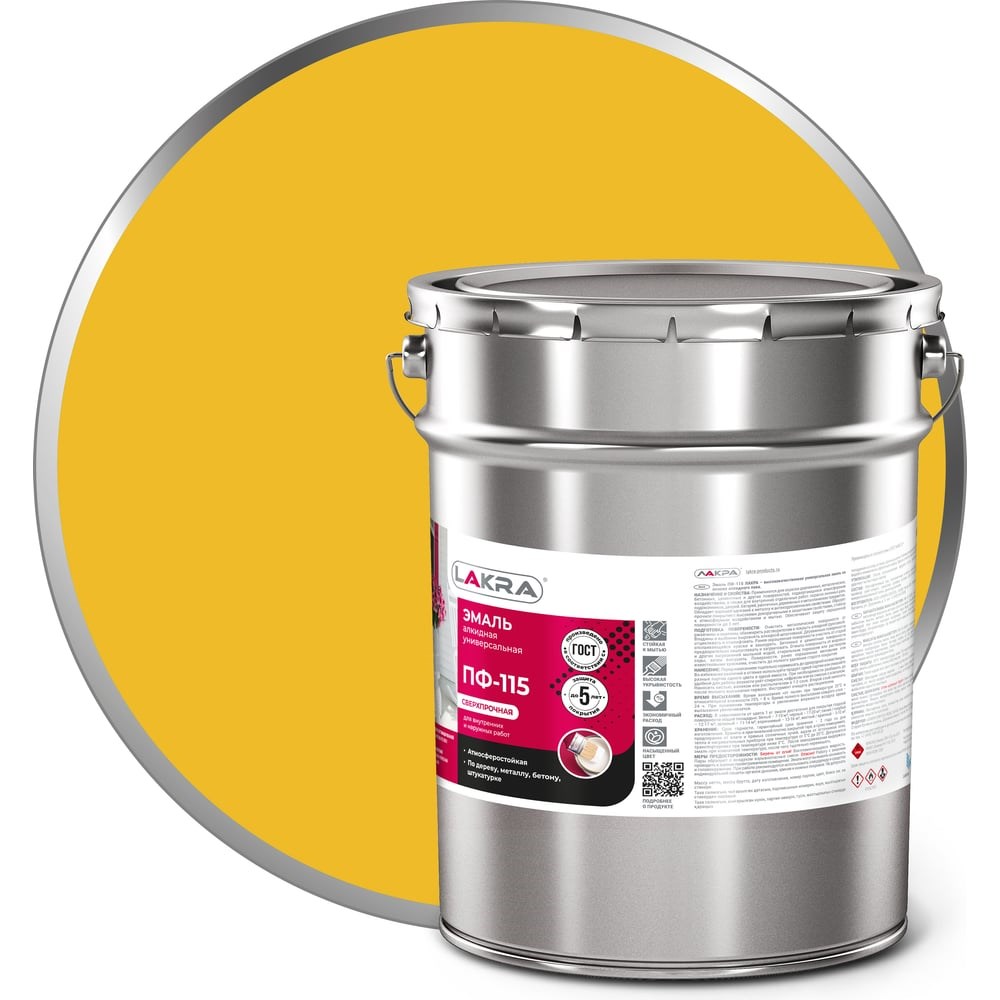 Эмаль Лакра ПФ-115 жёлтая, 20 кг 90000682904 предназначена для прокраски деревянных рам, дверей и металлических изделий. Легка в нанесении, обладает прекрасной укрывистостью и адгезией. Готовое покрытие защищает поверхность изделия от влаги и неблагоприятных условий окружающей среды.