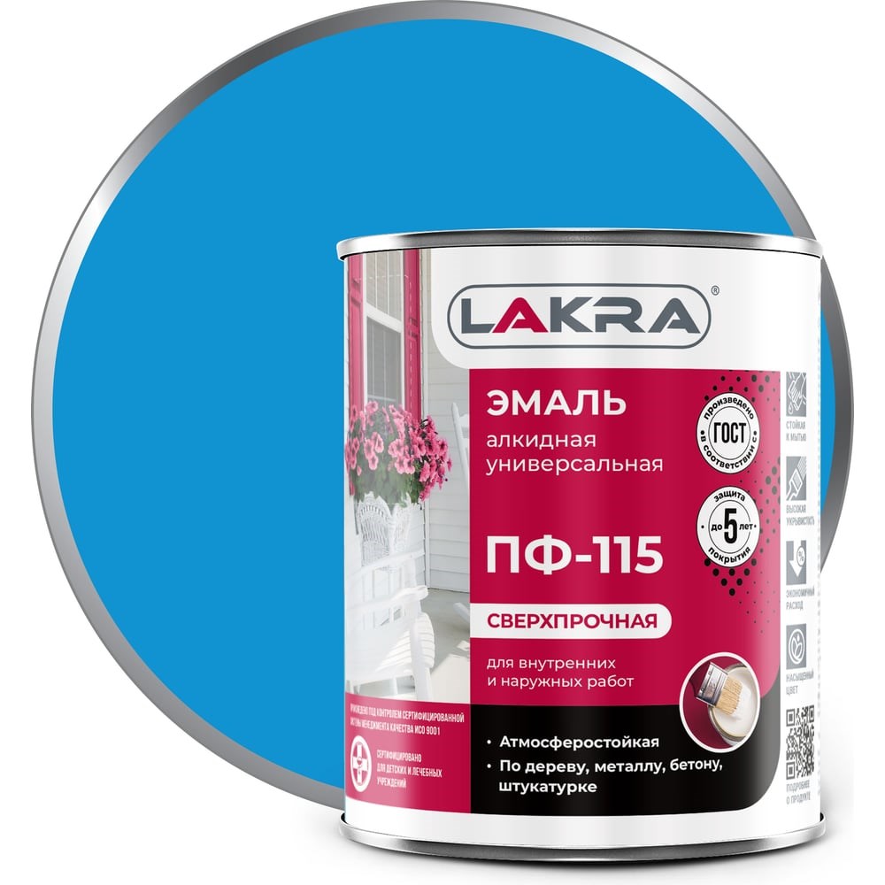 Эмаль Лакра ПФ-115 голубая, 1 кг 90000653880 предназначена для прокраски деревянных рам, дверей и металлических изделий. Легка в нанесении, обладает прекрасной укрывистостью и адгезией. Готовое покрытие защищает поверхность изделия от влаги и неблагоприятных условий окружающей среды.