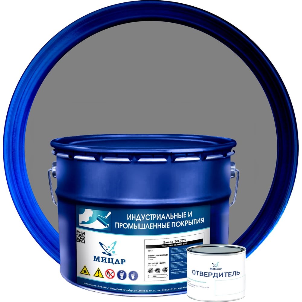 Эмаль Мицар ЭП-773 10 кг + 0.2 кг, серая УТ000013142 применяется для покраски ранее загрунтованных или нет поверхностей из металла. При эксплуатации могут подвергаться воздействию щелочей с высокой температурой (100 градусов). Покрытие образует однородную пленку без пузырей, морщин и других включений, небольшая шагрень допускается. Время высыхания одного слоя 24 часа.