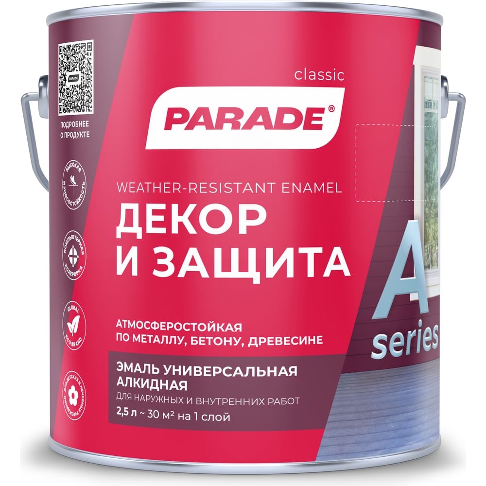 Эмаль глянцевая PARADE А3 Декор & Защита база А 2,5 л Россия 90001882476 - атмосферостойкая алкидная эмаль по металлу бетону, древесине. Для внутренних и наружных работ. Эмаль на основе высококачественных алкидных смол и очищенного растворителя. Образуемая пленка обладает высокими декоративными и защитными свойствами. Образует износоустойчивое, атмосферостойкое покрытие стабильной белизны. Обладает отличной укрывистостью, прочным сцеплением с окрашиваемой поверхностью. Быстро высыхает. Супербелая – эмаль в базе А. Сертифицирована для применения в детских и лечебных учреждениях.