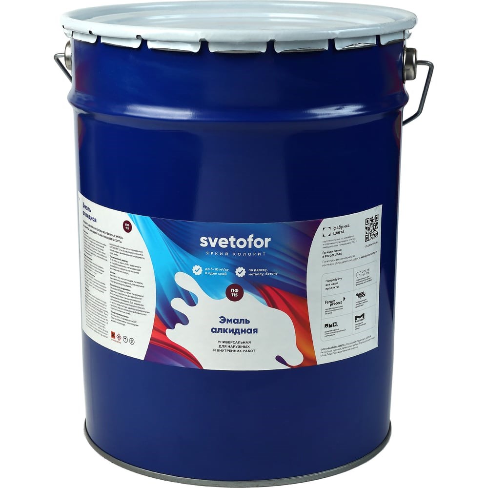 Эмаль Светофор ЛЮКС ПФ-115 серая, 25 кг ТД000002219 - алкидная универсальная эмаль с высокими декоративно-защитными свойствами. Продукт предназначен для окраски предварительно загрунтованных оснований из дерева, металла, кирпича, бетона. Используют для наружных и внутренних работ. Состав равномерно распределяется по поверхности и создает глянцевое покрытие стойкое к атмосферным воздействиям. Способ применения: Поверхность должна быть сухой, не иметь разделительных веществ (мел, известь, песок). Отслаивающиеся старые покрытия, ржавчину удалить, поверхность обезжирить. Для обеспечения высокой надежности покрытия и снижения расхода эмали рекомендуется обработать металлические поверхности алкидной грунтовкой Светофор. Эмаль тщательно перемешать и наносить при температуре окружающего воздуха и окрашиваемой поверхности не ниже +5 градусов кистью, валиком или методом распыления в 1 - 2 слоя с промежуточной сушкой. Время высыхания каждого слоя при температуре +20 градусов и влажности воздуха > 70 % не более 24 часов. При загустевании или перед окраской пневмораспылителем продукт разбавляется до рабочей вязкости уайт-спиритом или сольвентом Светофор. Состав: алкидный лак высшего сорта, пигменты, наполнители, растворитель, специальные модифицирующие добавки.