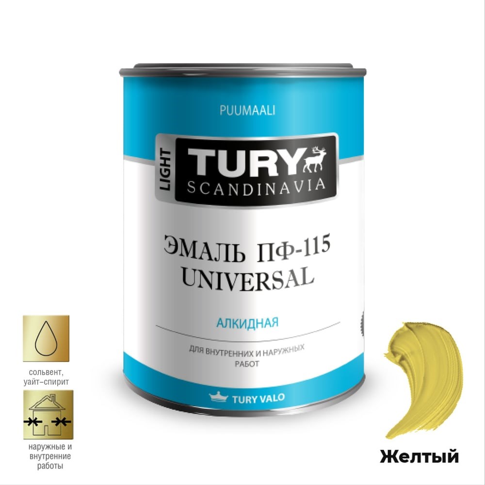 Эмаль TURY Универсал ПФ-115 желтая, 0.9 кг 2007199 на основе алкидной смолы для внутренних и наружных работ. Применяется для окраски деревянных, бетонных, кирпичных, оштукатуренных и загрунтованных металлических поверхностей, гипрока, ДСП, ДВП и ОСБ-плит.Благодаря составу, продукт подходит для помещений с повышенной влажностью, а также поверхностей, подверженных длительному атмосферному воздействию. Используют для обработки как новых, так и для ранее окрашенных поверхностей (кроме полов).