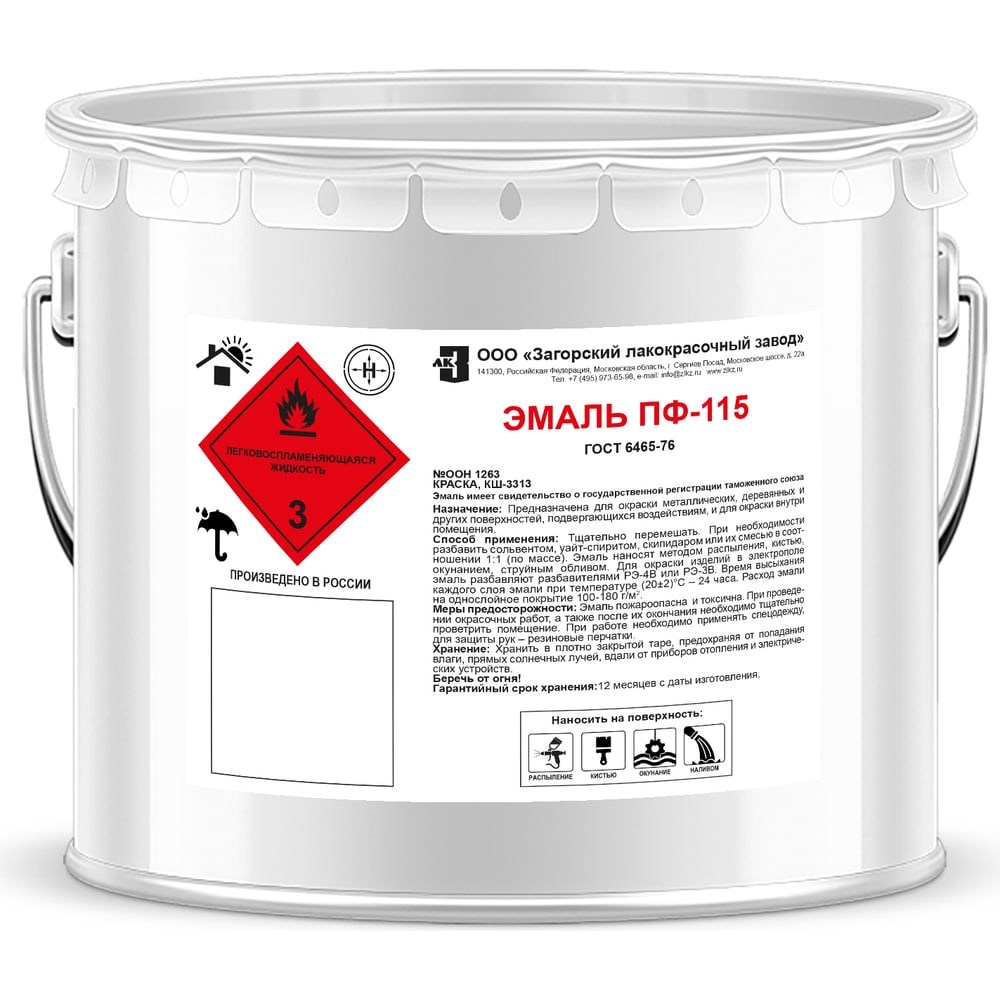 Эмаль ЗАГОРСКИЙ ЛАКОКРАСОЧНЫЙ ЗАВОД ПФ-115 серая 10 кг ZLK05368 предназначена для защитно-декоративного окрашивания поверхностей внутри и снаружи помещений (фасад, цоколь, стены, радиаторы). Универсальный состав можно использовать как самостоятельное покрытие или в комплексе с различными грунтовками. Продукт подходит для большинства строительных оснований: металл, дерево, кирпич, цемент, бетон, штукатурка. Эмаль устойчива к атмосферным воздействиям влажной уборке.
