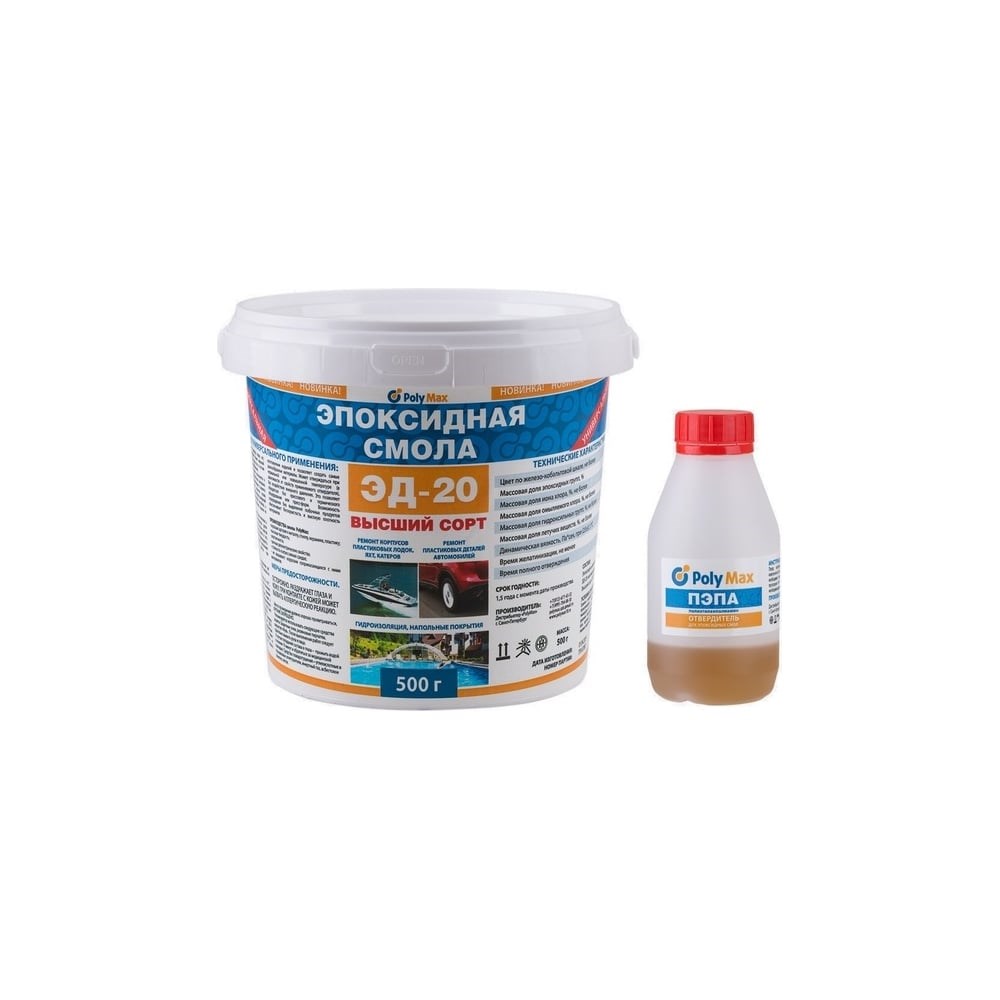 Эпоксидная смола ЭД-20 (500 гр.) с отвердителем ПЭПА (50 гр.) Смола ЭД-20 - это качественный материал для тех, кто занимается ремонтом и строительством лодок, яхт, изготовлением обвесов, бамперов, авто-тюнингом, авиамоделированием. ЭД-20 пригодна для изготовления эмалей, лаков, шпатлевок, в качестве полуфабриката для производства других эпоксидных смол и добавок к ним. Итоговые свойства изделия на основе эпоксидной смолы зависят от того, какими отвердителями, добавками они модифицируютсяОтвердитель:ПЭПА - классический отвердитель для смолы ЭД-20, от светло-желтого до темно-бурого цвета без механических включений. Особенности отвердителя, быстрая полимеризация состава. Популярен в композиции с ЭД-20 для получения клеевого состава. Использовать при температуре не ниже + 20 c Дополнительные характеристики:Цвет по железо-кобальтовой шкалене более 3Массовая доля эпоксидных групп% 2-22,5Массовая доля иона хлора%, не более 0,001Массовая доля омыляемого хлора%, не более 0,3Массовая доля гидроксильных групп%, не более 1,7Массовая доля летучих веществ%, не более 0,2Динамическая вязкость Па*сек, при (25±0,1)°C 13-20Динамическая вязкость Па*сек, при (25±0,1)°C 13-20Время желатинизации не менее 8 ч.Время полного отверждения 24 ч