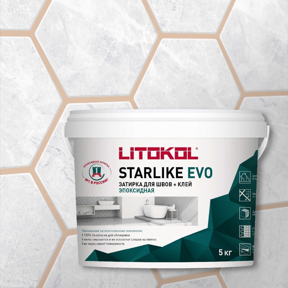 STARLIKE EVO двухкомпонентный эпоксидный кислотостойкий, щелочестойкий состав для затирки межплиточных швов с шириной шва от 1 до 15 мм и использования в качестве клея для всех видов облицовочной плитки и мозаики. Компонент А представляет собой смесь эпоксидной смолы, цветных микросфер и специальных органических добавок. Компонент В — инновационный органический катализатор (отвердитель). После смешивания компонентов А и В получается кремообразный состав удобный в работе. После полной полимеризации обладает непревзойденной гладкостью поверхности шва, высокой стойкостью к механическим воздействиям и превосходной химической стойкостью. Область применения: для внутренних и наружных работ, затирка швов, укладка плитки или мозаики, бассейны, душевые кабины, кухни, ванные комнаты и т.д.