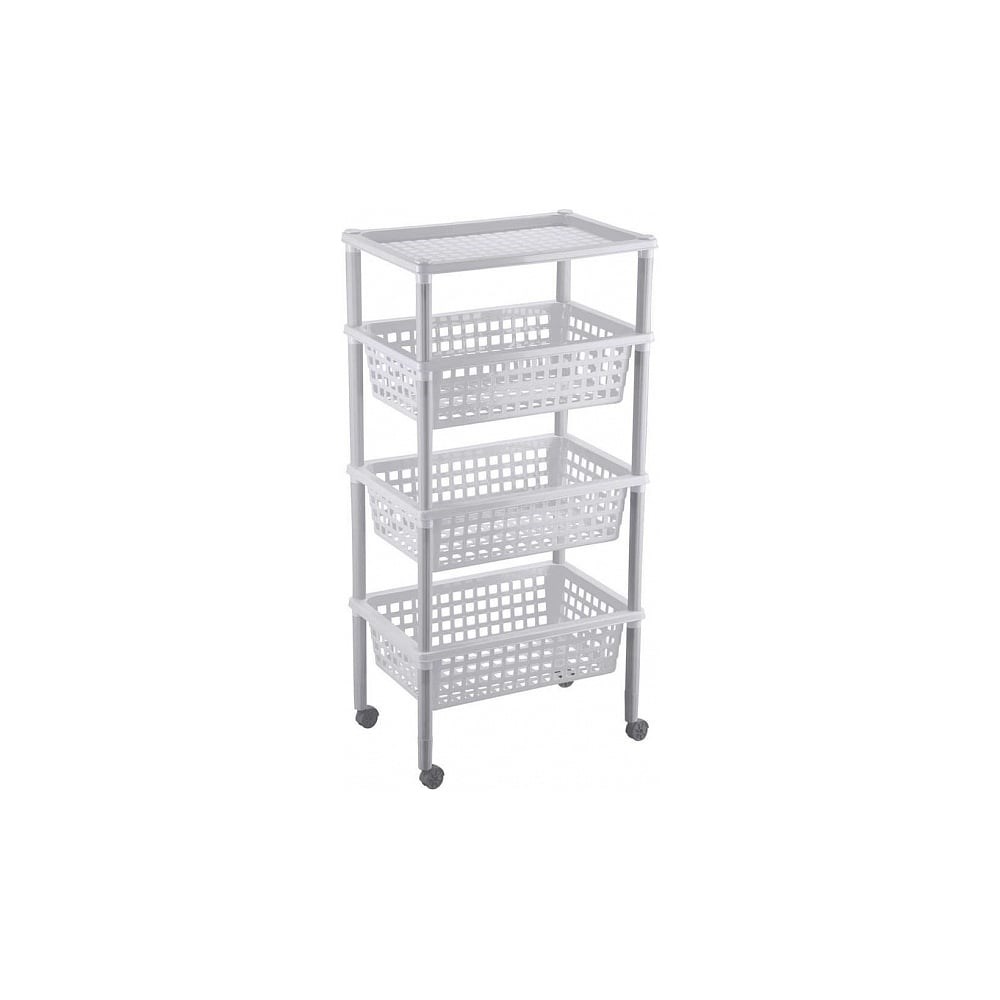 Этажерка Бытпласт Элиза 3 корзины + 1 полка, 420х290х880 мм, светло-серый 431240630 предназначена для организации порядка. Подходит для хранения овощей и фруктов, книг, газет, журналов, средств гигиены и бытовой химии. Относится к открытому типу, что обеспечивает хорошую вентиляцию. Этажерка оснащена колесиками, поэтому легко перемещается.