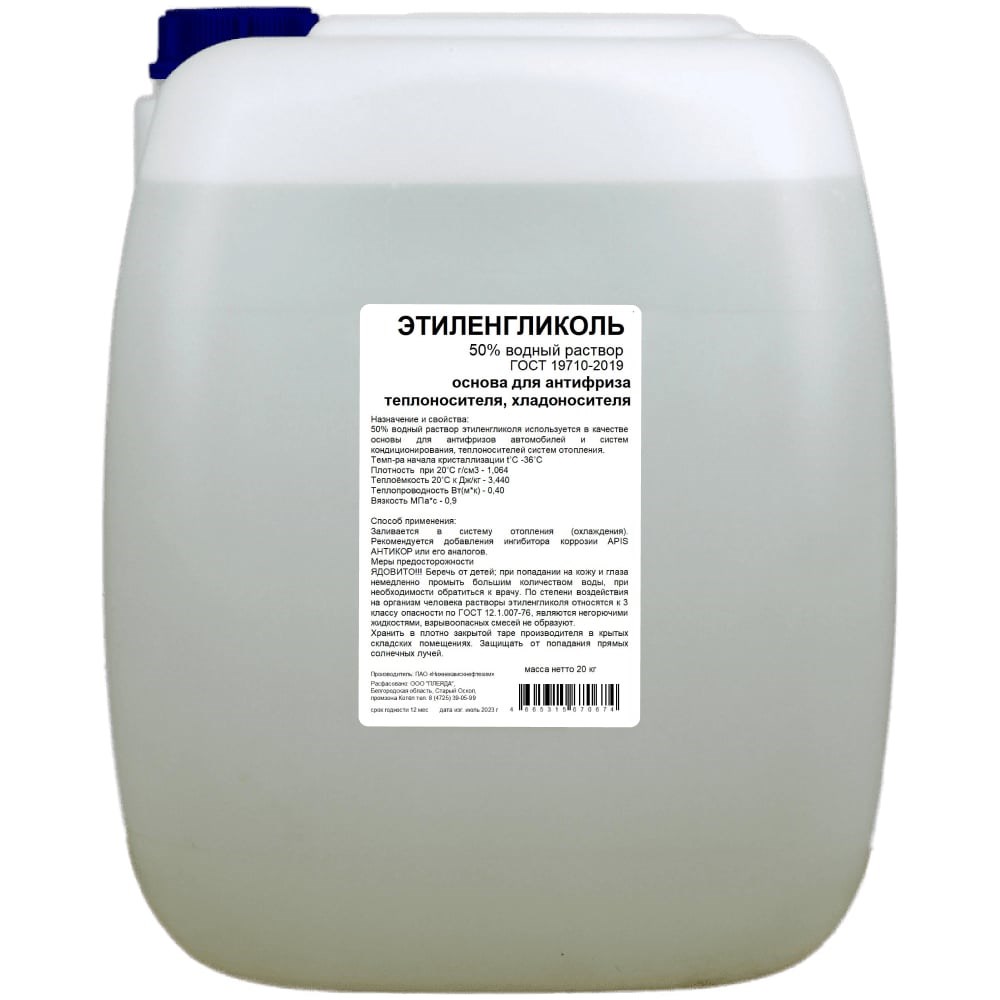 Водные растворы этиленгликоля широко применяются в автономных системах отопления, охлаждения, вентиляции и промышленного кондиционирования в качестве теплохладоносителя. ГОСТ 19710-2019. Температура начала кристаллизации — -36˚С Плотность при 20˚С — 1,064 г/см3 Теплоёмкость 20˚С — 3,440 кДж/кг Теплопроводность — 0,40 Втм*к Вязкость — 0,9 МПа*с