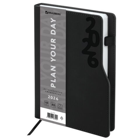 Ежедневник датированный 2026, А5, 150x213 мм, BRAUBERG "Up", под кожу, софт-тач, держатель для ручки, черный, 117116
