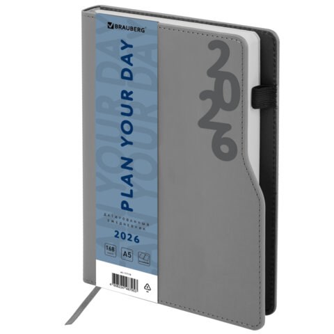 Ежедневник датированный 2026, А5, 150x213 мм, BRAUBERG "Up", под кожу, софт-тач, держатель для ручки, серый, 117119