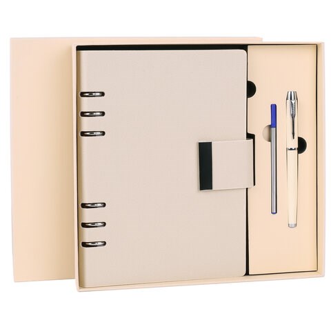 Ежедневник на кольцах в наборе с ручкой А5, 165x229 мм, BRAUBERG "Lux", под кожу, 100 листов, бежевый, 116859