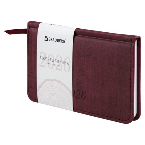 Еженедельник датированный 2026 МАЛЫЙ ФОРМАТ 95х155 мм, А6, BRAUBERG "Wood", под кожу, бордо, 117196