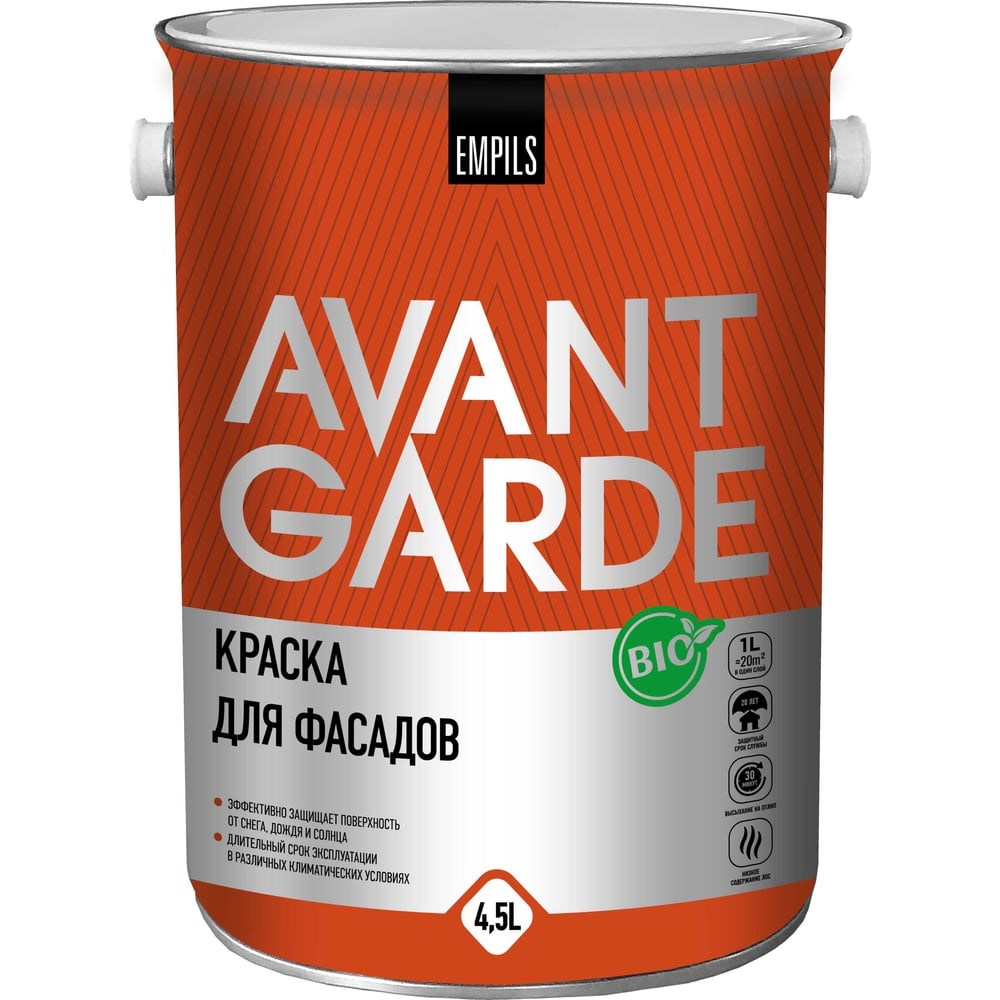 Фасадная краска Avantgarde база С, 4.5 л, 6.2 кг 77676 предназначена для нанесения на минеральные поверхности снаружи и внутри помещений (штукатурка, шпатлевка, асбоцемент, ГВЛ, допустимо на ГКЛ, в том числе ранее окрашенными акриловыми и алкидными ЛКМ после их предварительной подготовки), а также на предварительно загрунтованные деревянные поверхности. Подходит для эксплуатации в помещениях, подвергающихся частому мытью. Краска в соответствии с техническими характеристиками допускается к применению в детских комнатах, дошкольных, школьных, лечебно-профилактических учреждениях и предприятиях общественного питания. База С может быть использования только в колерованном виде, служит для получения насыщенных оттенков.