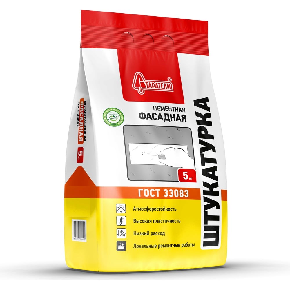Фасадная цементная штукатурка Старатели 5 кг 3277/3592 предназначена для ручного и механизированного оштукатуривания поверхностей фасадов выше цокольной части, выравнивания стен в помещениях с любым уровнем влажности (в том числе неотапливаемых), а также для ремонта сколов, выбоин и трещин глубиной до 60 мм. Подходит для всех типов зданий и сооружений А-В (жилые дома, детские учреждения, организации здравоохранения, санатории, спортивные сооружения, промышленные предприятия, административные здания и т.д.), включая помещения, где предусмотрен режим влажной дезинфекции. Не предназначена для прямого контакта с питьевой водой и пищевыми продуктами. Рекомендуемая толщина слоя: до 30 мм Толщина слоя при многослойном нанесении: до 60 мм Расход смеси при слое 10 мм: 13-14 кг/м2 Пропорции замеса: 0,18-0,24 л/кг (4,5-6 л/25 кг) Вид последующего покрытия Шпатлевка Декоративная штукатурка Плитка, керамогранит, камень Краска (возможно) Цементно-песчаная штукатурка