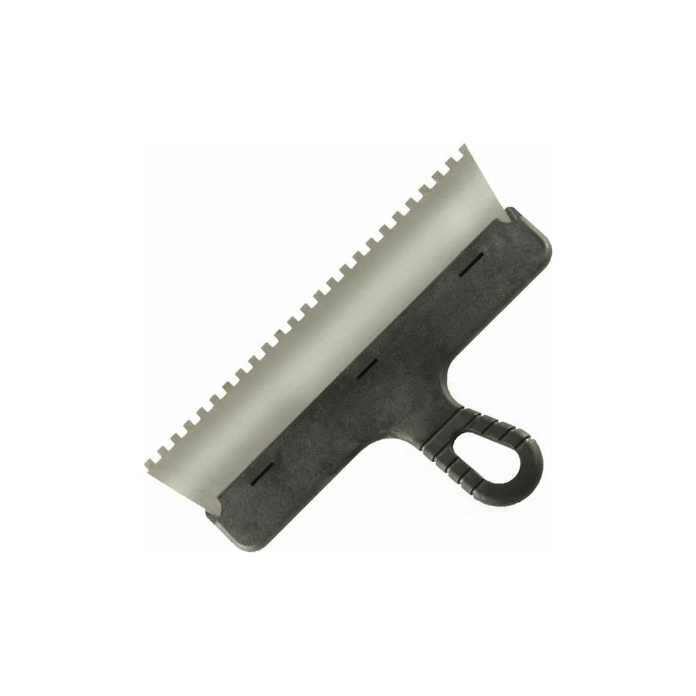 Применяется на различных поверхностях для равномерного нанесения и выравнивания разнообразных строительных и отделочных растворов и смесей (клеевых растворов, иных отделочных материалов), и их последующего разравнивания с образованием борозд. Материал полотна: нержавеющая сталь; Материал ручки: пластик; Отверстие для подвешивания: есть; Ширина: 150 мм; Размер зубцов: 6 x 6 мм.