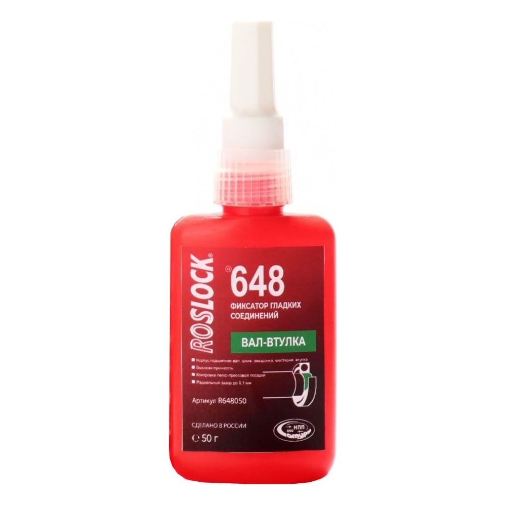 Фиксатор гладких соединений ROSLOCK 648 (вал-втулка; высокой прочности; 50 гр) R648050 представляет собой состав высокой прочности с нормальной и легко-прессовой посадкой. Может применяться на слегка замасленных новых поверхностях. Свойства жидкого герметика Вязкость по Брукфильду RVT (A/2/20) при 25 °С по ГОСТ 25271: 400 – 600 мПа*с Температура вспышки: > 145°С, не содержит растворителей Набор прочности Болт-гайка М10х1,5-6g/6H из стали марки 30 при (18 - 25) °С по ISO 10964: Ручная прочность через (10 – 30) мин Ручная прочность с активатором - до 5 мин Функциональная прочность - через (3 – 6) ч Максимальная прочность - через 24 ч Свойства отвержденного герметика Аксиальный сдвиг на стали марки 30 (Rz = 20 мкм) при (18 - 25) °С по ISO 10123:2013: Предел прочности через 24 ч: (25 – 30) МПа Отрыв на стали марки 30 (Rz = 20 мкм) через 24 ч при (18 - 25) °С по ГОСТ 14760: Предел прочности через 24 ч: не менее 30 МПа Болт-гайка М10х1,5-6g/6H из стали марки 30 ГОСТ 1050 при (18 - 25) °С по ISO 10964: Момент отвинчивания через 24 ч: (40 – 50) Н*м