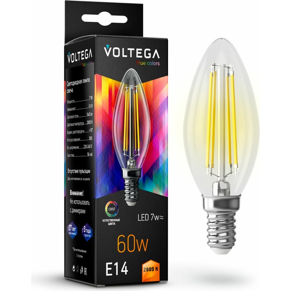 Филаментная лампа VOLTEGA Свеча Е14 2800К 7W CRI97 7152 отлично подходит для освещения на 360 градусов. Идеально смотрится в люстрах, бра, настольных светильниках и торшерах.