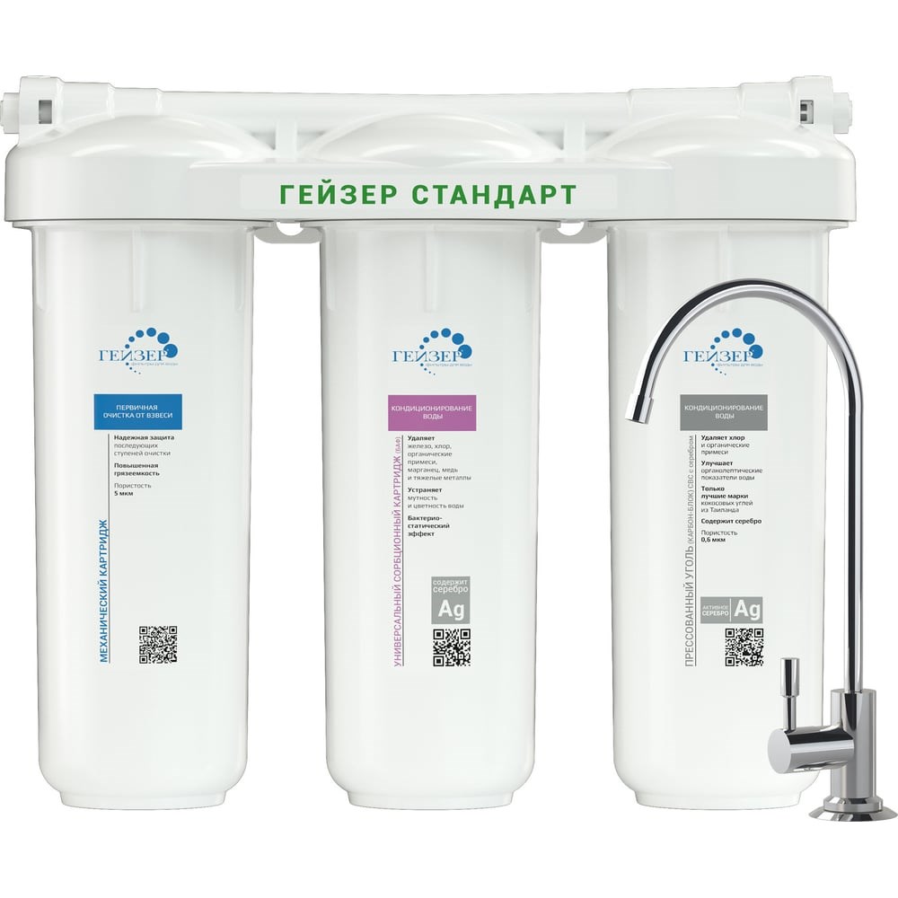 Фильтр для воды Гейзер Стандарт 19062 предназначен для очистки мягкой водопроводной воды. Фильтр способен удалить из воды излишкивзвешенных частиц, мутности, цветности, хлора, тяжелых металлов, органических соединений и др. примесей. Фильтр включает в себя:полипропиленовый модуль PP, 10"SLIM - для удаления нерастворимых частиц(песок, взвесь, ржавчина);Карбон блок CBC 10" SLIM, благодаря которомуиз воды удаляетсяхлор, фенол, органические и хлорорганические соединения, а также неприятный вкус и запах;сорбционный картридж (БАФ) - на данной стадииудаляется не только хлор и органические примеси, но и снижает содержание железа и тяжелых металлов.Рекомендуемая скорость фильтрации -не более 3 л/мин;Рабочее давление - не менее 0,5 атм;Температура воды - не более 40 °С;Ресурс -раз в 1 - 1,5 год;Минерализация - нет;3 года гарантии.
