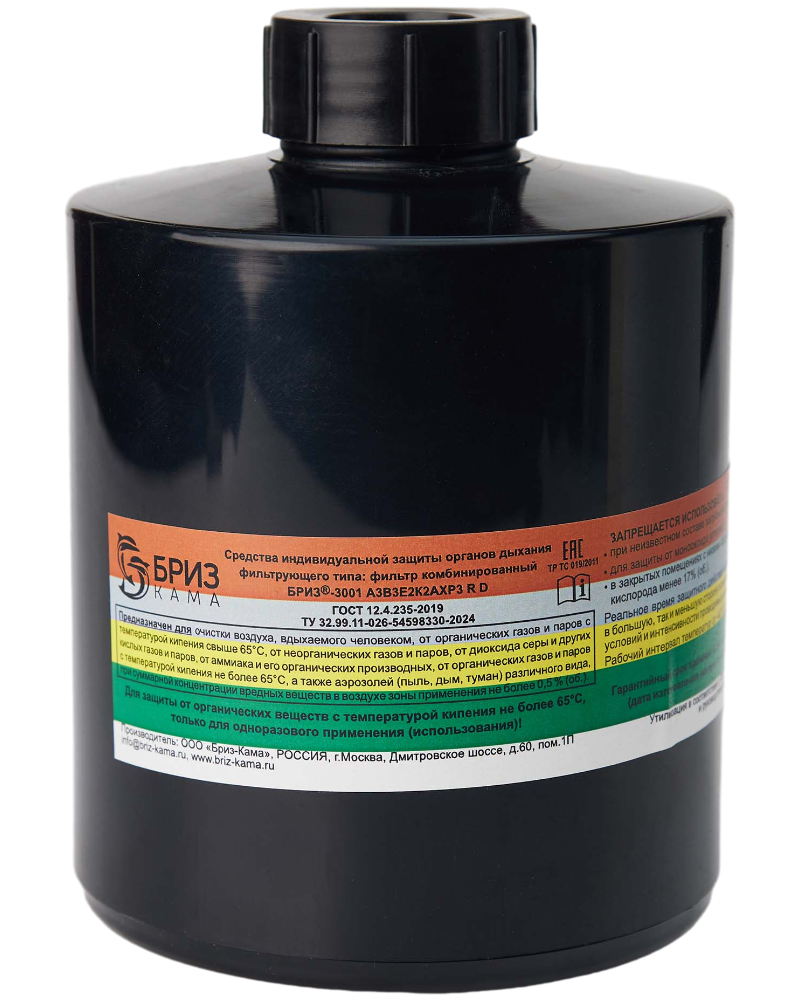 Фильтр комбинированный «БРИЗ®-3001» A3B3E2K2AXP3 R D применяется для очистки вдыхаемого загрязненного воздуха от: