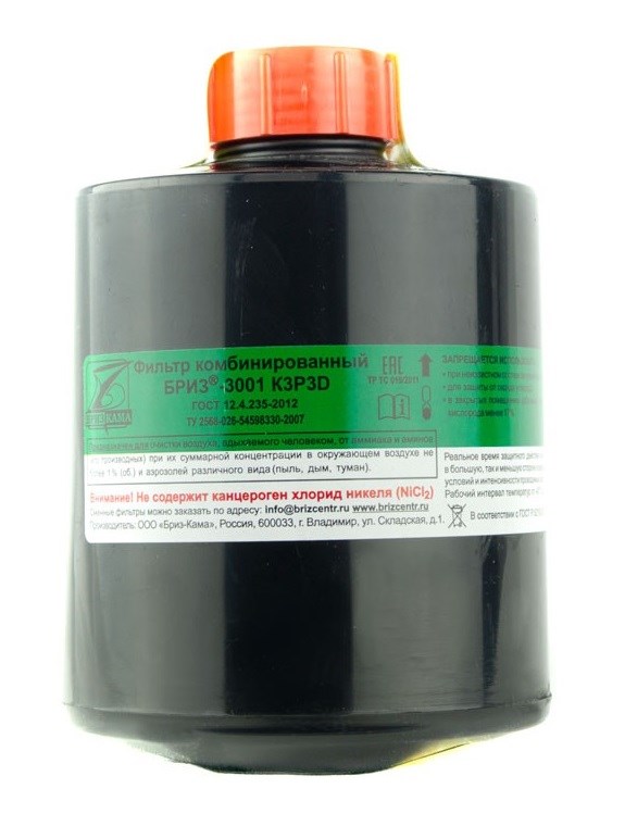 Фильтр комбинированный Бриз-3001 K3P3D применяtтся для очистки вдыхаемого загрязненного воздуха от: - аммиака и производных - аэрозольных частиц малотоксичных веществ, содержащихся в пыли, дыме или тумане Фильтр K3P3 третьего класса защиты предназначена для использования: - совместно с маской панорамного типа и шлем-маской ШМП в составе противогаза фильтрующего для промышленности Время защитного действия фильтра K3P3D по тест-веществам: - по аммиаку при С0=3500 мг/м3 - 40 мин Используется при объёмной доле свободного кислорода - не менее 17%. Корпус произведен из пластмассы с ударопрочными свойствами. Соединительная резьба соответствует ГОСТ 8762-75 (40х4,0 мм).
