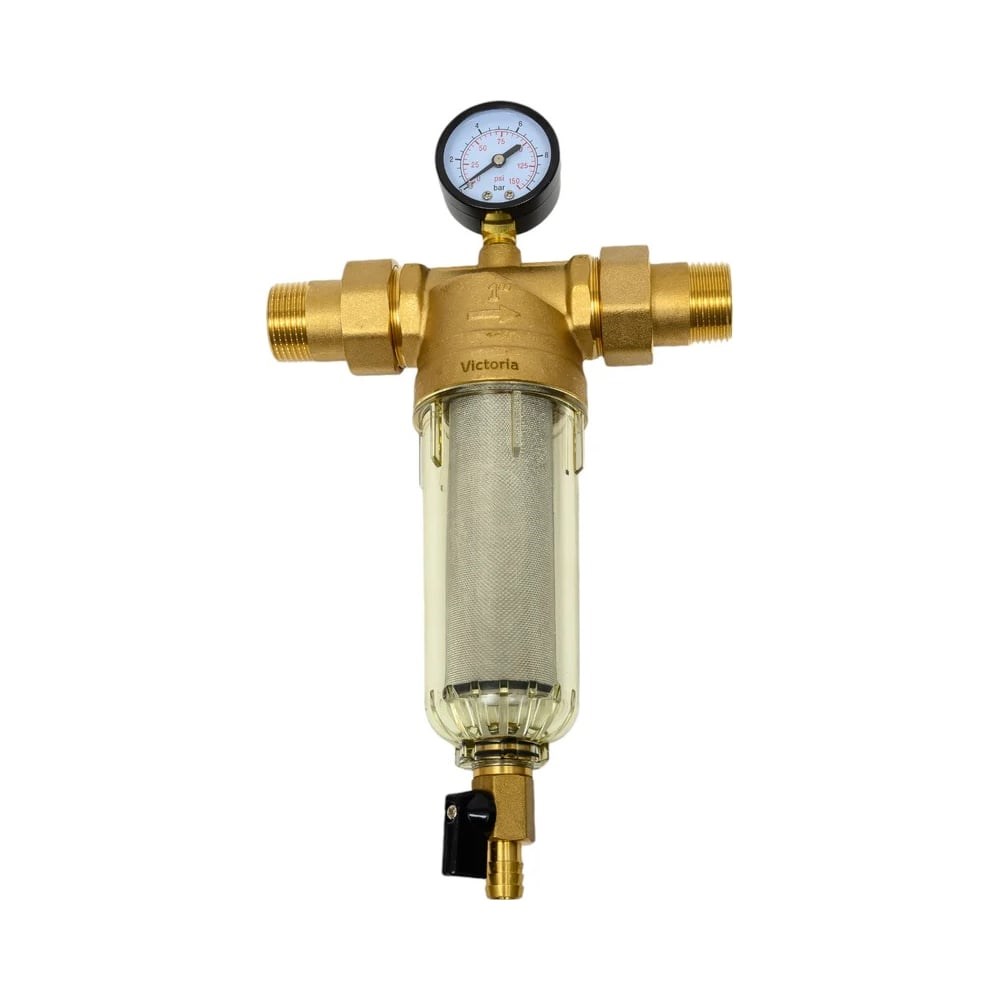 Промывной фильтр с манометром для холодной воды Victoria 1/2" (тонкая очистка) с американками 27-701