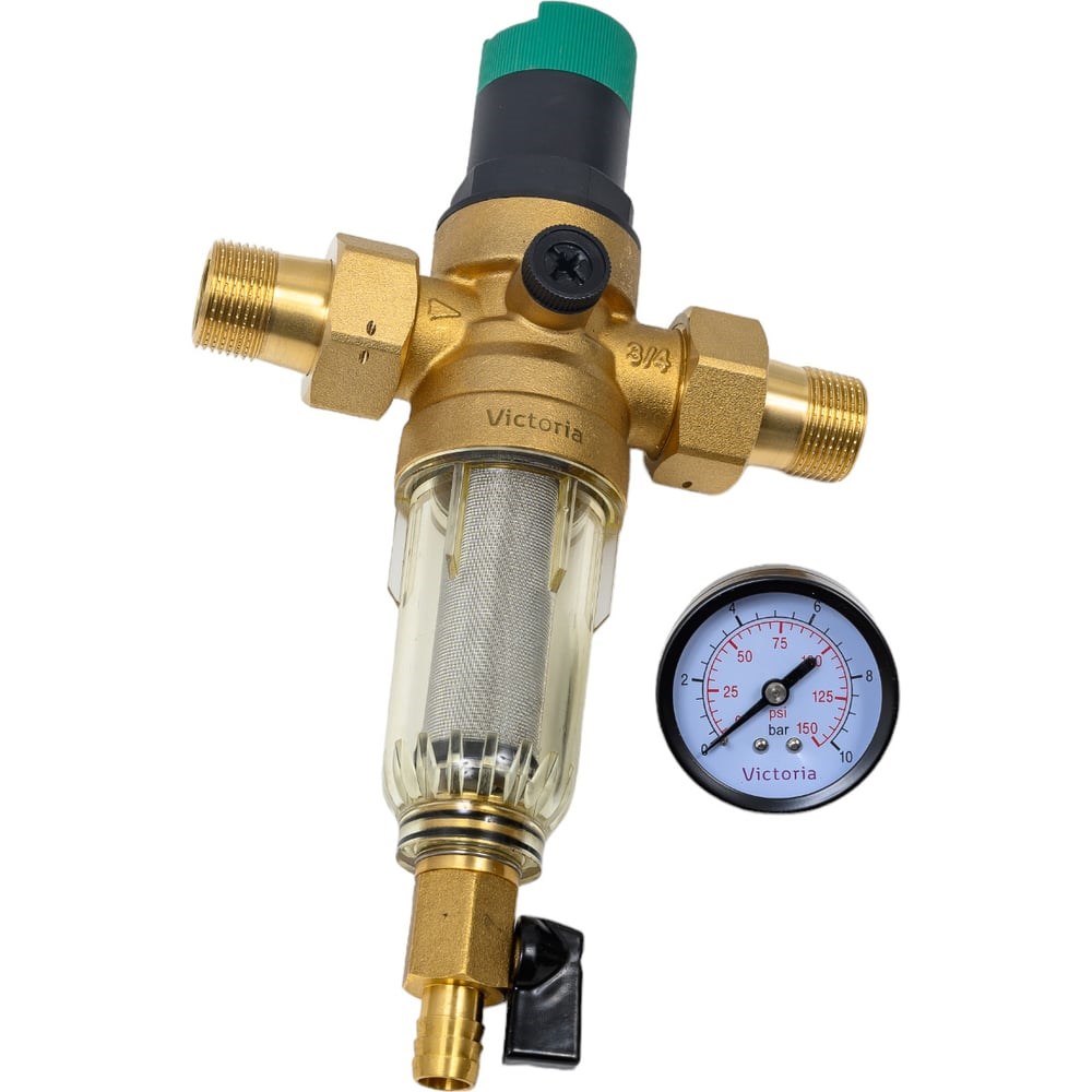 Промывной фильтр с редуктором давления и манометром для холодной воды Victoria 3/4"(тонкая очистка)с американками 27-708