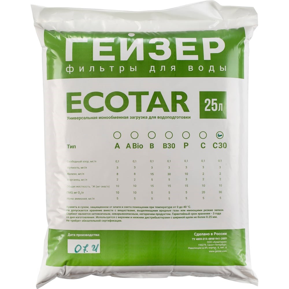 Мультикомпонентная фильтрующая загрузка Экотар С30 – используется для водоподготовки в загородных домах, производствах, котельных, предприятиях общественного питания и др. Рекомендуется для очистки воды из неглубоких скважин, колодцев и открытых водоемов с высоким содержанием природных органических веществ (до 30 мг/л), органического железа и марганца. Визуальная оценка исходной воды: имеет окраску от желтой до коричневой, не образуется осадок. Регенерация фильтрующей загрузки Экотар С30 производится раствором соли (в солевом баке). Экотар С30 работает при следующих показателях анализа воды: Растворённое железо: до 2 мг/л; Марганец: до 2 мг/л; Жёсткость: до 5 мг. экв./л; ПМО: до 30 O2/л; Мутность: не более 3 мг/л; Сероводород (запах тухлых яиц): отсутствует. Гарантийный срок хранения – 3 года со дня изготовления. Используется с верхним и нижним дистрибьютерами с шириной щели не более 0,25 мм. Объём: 25 л.