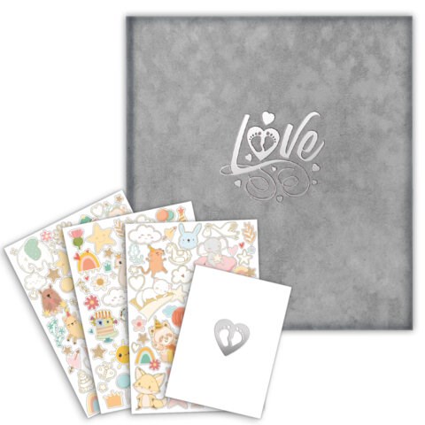 В набор входят 3 тематических листа стикеров, открытка с ножками в подарок, а также маленький конвертик для мелочей на внутренней стороне обложки, куда можно поместить бирку из роддома, снимок УЗИ, локон ребенка.