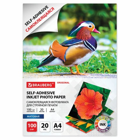 Фотобумага САМОКЛЕЯЩАЯСЯ матовая, А4, 100 г/м2, 20 листов, BRAUBERG ORIGINAL, 364006