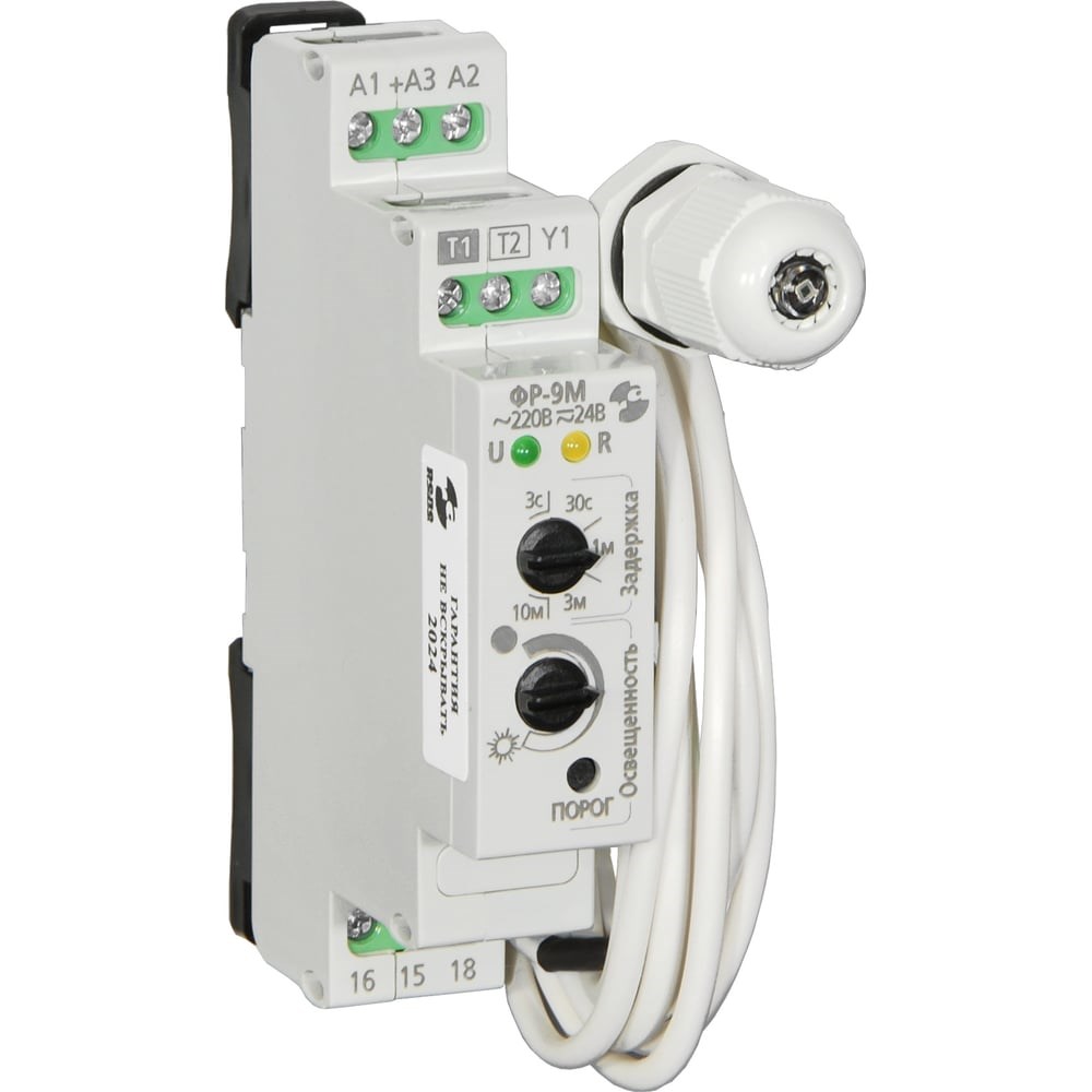Фотореле Реле и Автоматика, ФР-9М с датчиком, кабель 25м A8222-80108776 предназначено для управления уличным освещением. Благодаря автоматическому включению и отключению осветительных приборов позволяет сэкономить электроэнергию. Существует выбор между двумя диапазонами освещенности: от 0.5 до 30Лк, либо от 10 до 450Лк. Внутри диапазона регулировка срабатывания производится потенциометром. Также, есть возможность настройки срабатывания фотореле путем использования отдельной кнопки. В этом случае в память устройства записывается то значение освещенности, при котором была нажата клавиша. Данное реле снабжено еще одной функцией — настраиваемой задержкой включения и выключения. При необходимости, эту величину можно выбрать из следующих значений: 3c, 30c, 1мин, 3мин, 10мин.