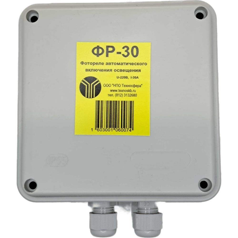 Фотореле Техносфера ФР-30, 220В, 30А 1603001060074 предназначен для автоматической регулировки наружного освещения в зависимости от времени суток. Выносной герметичный сенсор входит в комплект. На электронной плате реле расположены индикатор включения. Есть настройка уровня освещенности срабатывания. Дополнительные характеристики: Коммутируемый ток контакта (АС 250В) - 0.01-30А. Чувствительность фотодатчика - 1-200Лк. Задержка включения/выключения (плавная регулировка) - 0-600сек. Степень защиты реле - IP55. Степень защиты датчик - IP65. Климатическое исполнение - У3 (от -45º С до +45ºС).