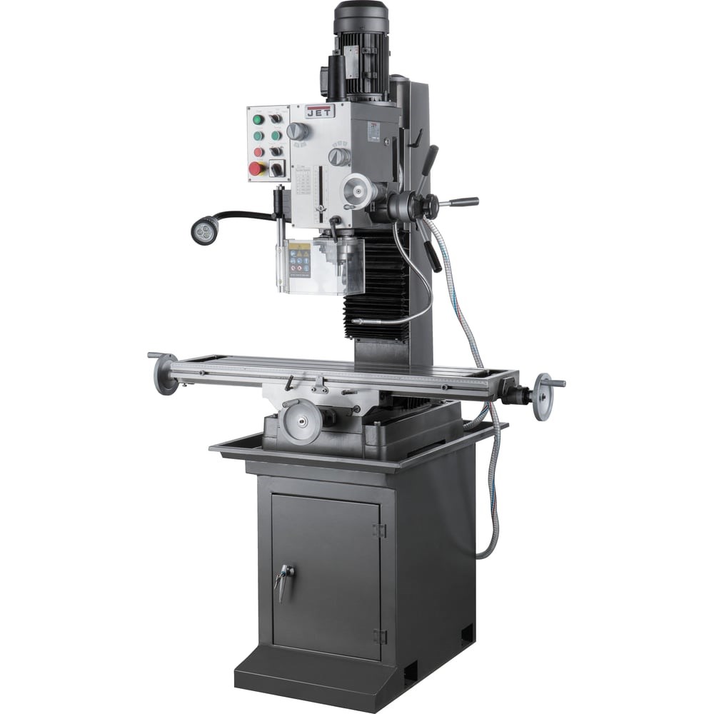 Фрезерно-сверлильный станок JET JMD-45L 50000856T используют для аккуратного сверления и точного фрезерования различных деталей из чугуна и стали. Усиленная конструкция и мощный двигатель (1.5 кВт) обеспечивают продолжительную работу в условиях производства. Станок имеет 2 скорости вращения шпинделя и плавную регулировку частоты оборотов в диапазоне от 75 до 3200 об/мин. Подъем и опускание шпиндельной бабки осуществляют при помощи рукоятки ручной подачи. Для удобства оператора все основные элементы управления вынесены на переднюю панель аппарата. Кнопка аварийной остановки немедленно отключает двигатель во время опасной ситуации.