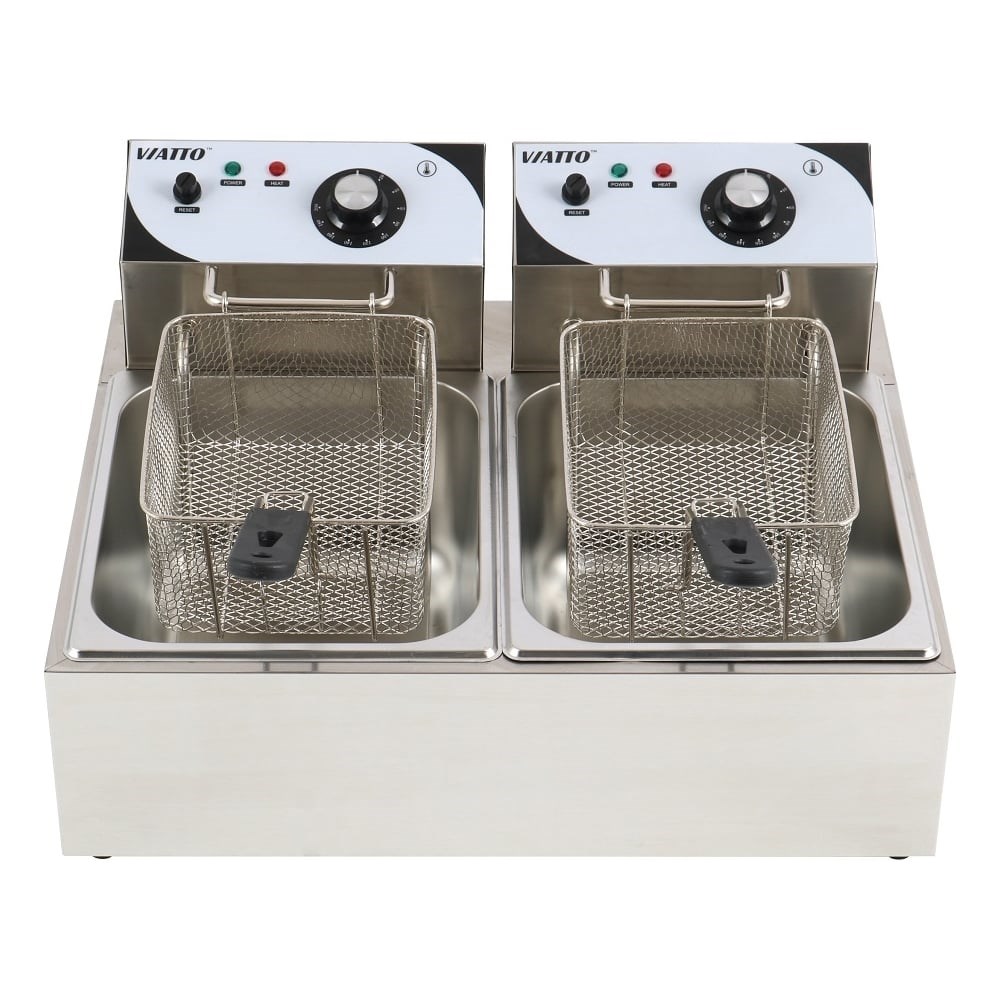Фритюрница Viatto VA-EF062 166687 используется на предприятиях общественного питания для обжарки различных продуктов в большом количестве масла. Корпус изготовлен из нержавеющей стали. Защита от перегрева. Независимая регулировка температуры в каждой ванне. Размер ванны 325х265х150 мм.