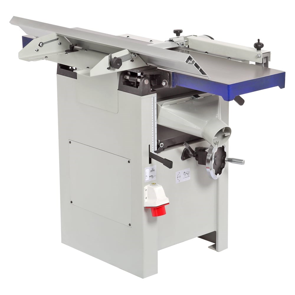 Фуговально-рейсмусовый станок Белмаш BELMASH JT-2 310/225S-380 S181A предназначен для фугования и рейсмусования. Оборудование совмещает в себе все операции для калибровки доски. Конструкцией станка предусмотрено использование массивных чугунных деталей, что обеспечивает прочность, устойчивость и работу без вибраций. При рейсмусовании верхний модуль целиком поднимается и не мешает ни работе, ни стружкоудалению. Станок оснащен удобным эксцентриковым механизмом регулировки положения столов, подающего и принимающего. Входящий в базовое оснащение вал helical снабжен твердосплавными режущими вставками. Вал обладает высокой надежностью и не требует регулировки. За счет последовательного входа ножей в заготовку вал работает тише и с меньшими вибрациями. Частота вращения в 5500 об/мин способствует чистому резу. Для строгания по торцу или под углом от 90 до 45 градусов станок оборудован параллельным упором, который выполнен из жесткого алюминиевого профиля.