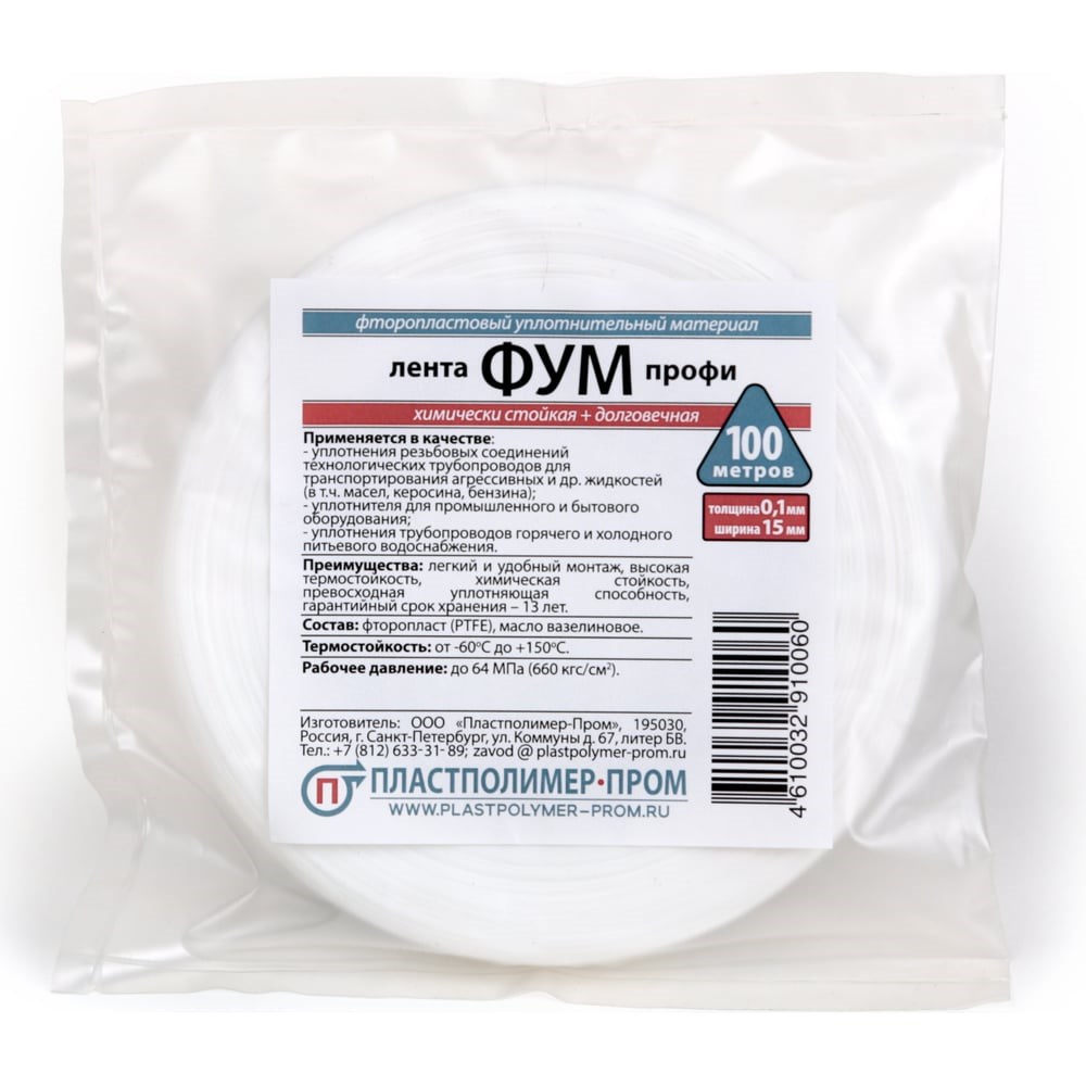ФУМ лента Пластполимер-Пром Профи, 0,1х15 мм, 100 м ЗВ-00001594 - это химически инертный уплотнительный материал, предназначенный для: уплотнения резьбовых соединений технологических трубопроводов для транспортирования агрессивных жидкостей и газов; технологического оборудования фармацевтической, пищевой и медицинской промышленности; уплотнения трубопроводов горячего и холодного питьевого. Дополнительные технические характеристики: Состав: 100% полиметрафторэтилен (фторопласт-4Д, PTFE). Термостойкость: от -60 до +150 °С. Рабочее давление: до 64 МПа (660 кгс/см2).