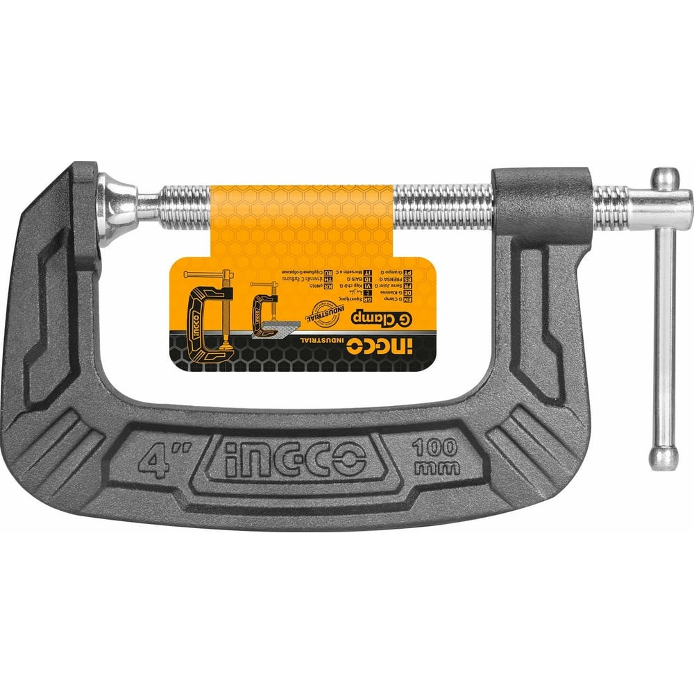 G-образная cтрубцина INGCO 100 мм HGC0104 обладает прочной стальной рамой. Инструмент выдерживает высокие нагрузки - подходит для столярных мастерских, а также для слесарного дела. Удобная рукоять и винтовой зажим позволяют эффективно стянуть губки. Для защиты поверхности деталей от повреждения используются пластиковые накладки.