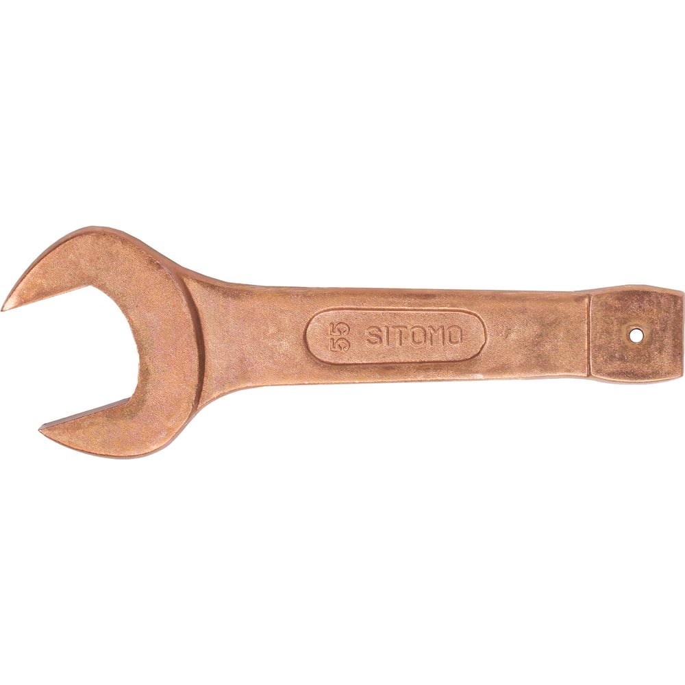Односторонний ударный гаечный ключ предназначен для работ с резьбовыми соединениями в процессе ремонтных и монтажных работ. Инструмент выполнен из высококачественной стали, благодаря чему отличается прочностью и долговечностью. Омедненное покрытие обладает повышенной устойчивостью к высокотемпературному воздействию случайной искры. Ключ может применяться на предприятиях с наличием потенциально опасных сред, а также в быту. Одна из рабочих поверхностей ключа предназначена для ударных воздействий с целью увеличения усилия при работе с тугими крепежными соединениями.