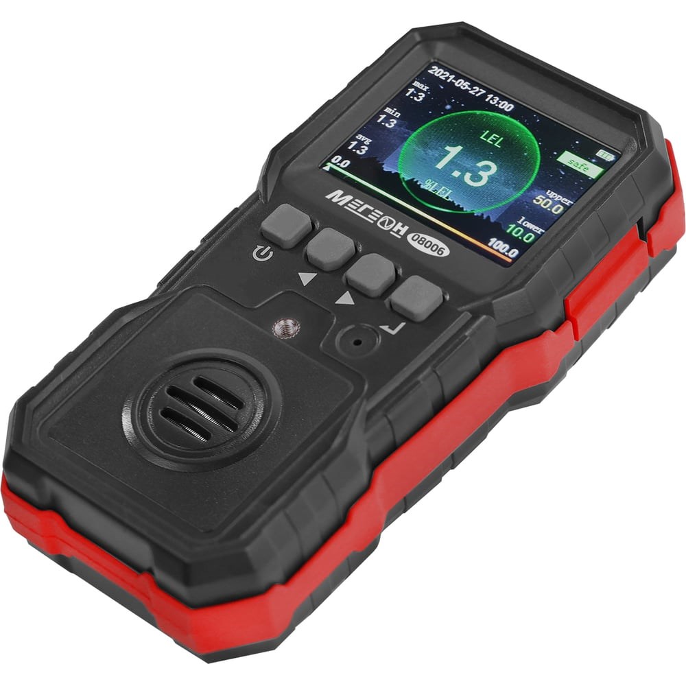 Газоанализатор для измерения концентрации горючих газов МЕГЕОН 08006 к0000034415 предназначен для измерения концентрации горючих газов в воздухе, в бытовых и промышленных зданиях и сооружениях. Имеет современный эргономичный корпус с силиконовой вставкой противоскольжения. Для нагрудного ношения и закрепления прибора на поясе на задней стенке предусмотрена стальная прищепка с кольцом. Все процессы отображаются на ярком цветном ЖК-дисплее. Данные могут быть записаны в память, которая позволяет сохранить до 120000 измерений. При этом обеспечивается удержание максимальных, минимальных и средних значений в автоматическом режиме. Три вида настраиваемой сигнализации включают в себя звуковое сопровождение, световую индикацию и вибрацию, которые осуществляют информирование при достижении концентрации одного из пределов тревоги. Одним из значимых преимуществ является возможность калибровки тремя методами по двум точкам. Питание осуществляется встроенным перезаряжаемым литиевым аккумулятором емкость 1800 мА/ч.
