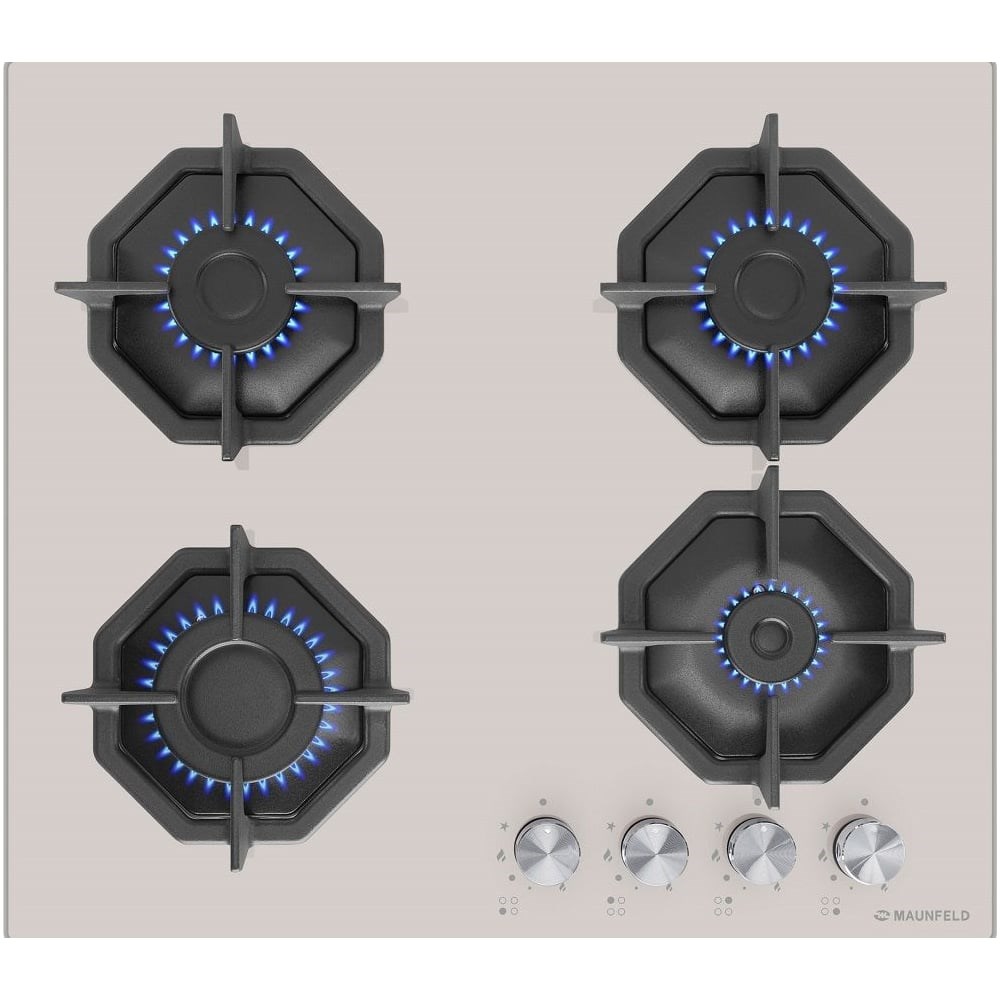 Дизайнерская встраиваемая газовая варочная панель шириной 60 см может работать от магистрального газа и газа в баллоне (тип G30), для этого достаточно поставить специальные жиклеры французской фирмы SOURDILLON, находящиеся в комплекте. Панель выполнена из закаленного стекла бежевого цвета. В данной модели установлены высококачественные итальянские горелки SABAF. Четыре стандартные конфорки мощностью 1000 Вт, 1700 Вт, 1700 Вт и 2600 Вт. Регулирование подачи газа и электроподжиг конфорок происходит с помощью поворотных регуляторов - полнотелых цельнометаллических ручек. Для простоты использования около каждой ручки нанесены информационные изображения: используемая конфорка, подача газа выключена, электроподжиг, максимальное пламя и минимальное пламя. Восьмиугольные чугунные подставки – это запатентованное изобретение MAUNFELD, прочные и долговечные. Сами конфорки спроектированы таким образом, что огонь не перегревает ни чугунные решетки, ни ручки управления. Система газ-контроля надежно защищает бытовой прибор от утечек газа при неожиданном затухании конфорки.
