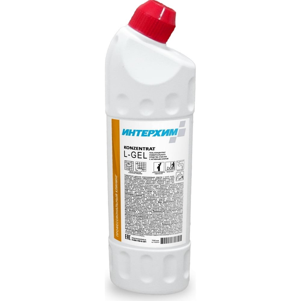 Гель-концентрат универсального средства очистки с активным хлором ИНТЕРХИМ Konzentrat L - Gel 0.75 kn00407 - щелочной хлорсодержащий гель эконом-класса для отбеливания поверхностей и удаления различных видов органических, неорганических и биологических загрязнений с сантехнического оборудования, унитазов, раковин, ванн, а также с полов, стен и др. моющихся поверхностей и покрытий, стойких к воздействию щелочных средств и гипохлорита натрия. Применяется как неразбавленным, так и в разбавлении до 1:80.