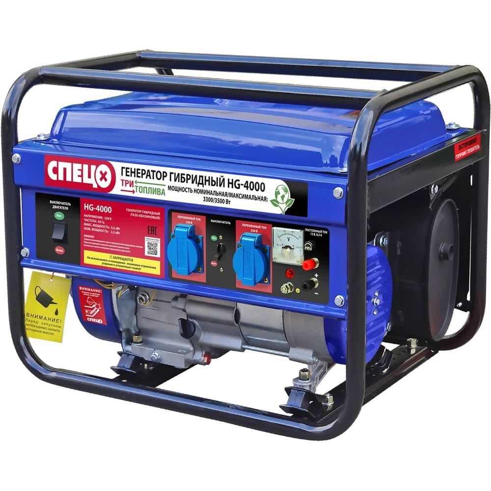 Генератор гибридный (газ-бензин) СПЕЦ HG-4000 предназначен для выработки однофазного электрического тока напряжением 230 В и частотой 50 Гц, в условиях аварийного или резервного электроснабжения, в повторно-кратковременном режиме. С его помощью можно осуществлять питание электроприборов, электроинструмента, приборов освещения и т. д.