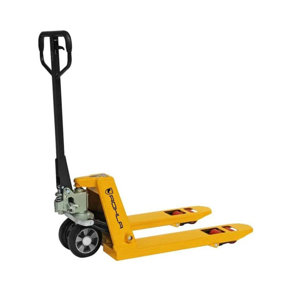 Гидравлическая коротковильная тележка RohlaRhino вилы 800 мм, грузоподъемность 2,5 т, колеса резиновые RR80SRDP - маневренная и удобная, подходит для работы на любых складах и производственных помещениях, а также для работы внутри кузова грузового транспорта и в условиях ограниченного пространства. Имеет литой гидроузел, рукоятку c усиленным основанием, регулируемые тяги на вилах. Комплектуется вспомогательными подвилочными роликами. Ведущие колеса диаметром 200 мм из обрезиненного металла и сдвоенные опорные ролики из полиуретана позволяют эксплуатировать тележку в помещениях с неровной поверхностью.