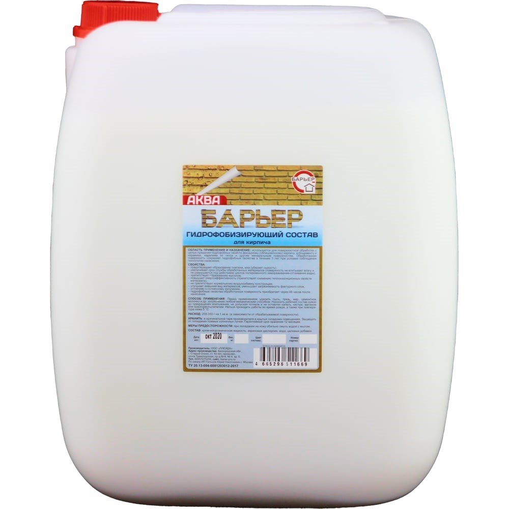 Гидрофобизирующий состав для кирпича БАРЬЕР АКВА канистра 30 кг 4665296513755 защищает сооружения из облицовочного кирпича от вредных атмосферных факторов (осадков и образования конденсата при перепаде температур). Придаёт обработанным поверхностям водо- и грязеотталкивающие свойства, которые при правильном нанесении сохраняются не менее 5 лет. Помогает увеличить срок службы строительных материалов. Предотвращает образование высолов.