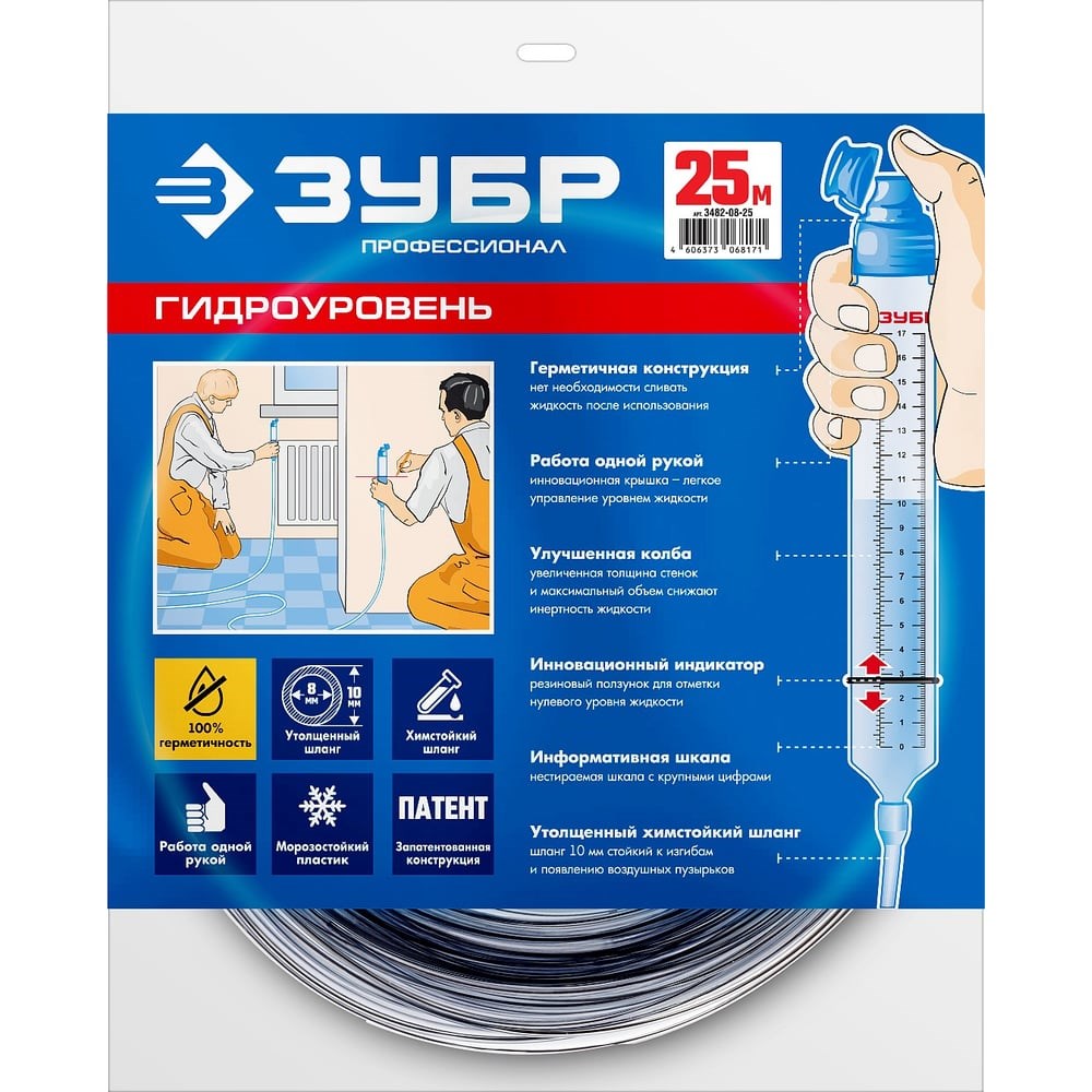 Строительный гидроуровень ЗУБР Профессионал 25 м 3482-08-25 - профессиональный строительный прибор. Используется для контроля и измерения, насколько точно взаиморасположены поверхностные элементы конструкции в горизонтальной плоскости. Работает по принципу сообщающихся сосудов, в которых уровни однородных жидкостей, считая от точки, наиболее близкой к поверхности земли, равны. Дополнительные характеристики: Диаметр шланга - 8 мм.