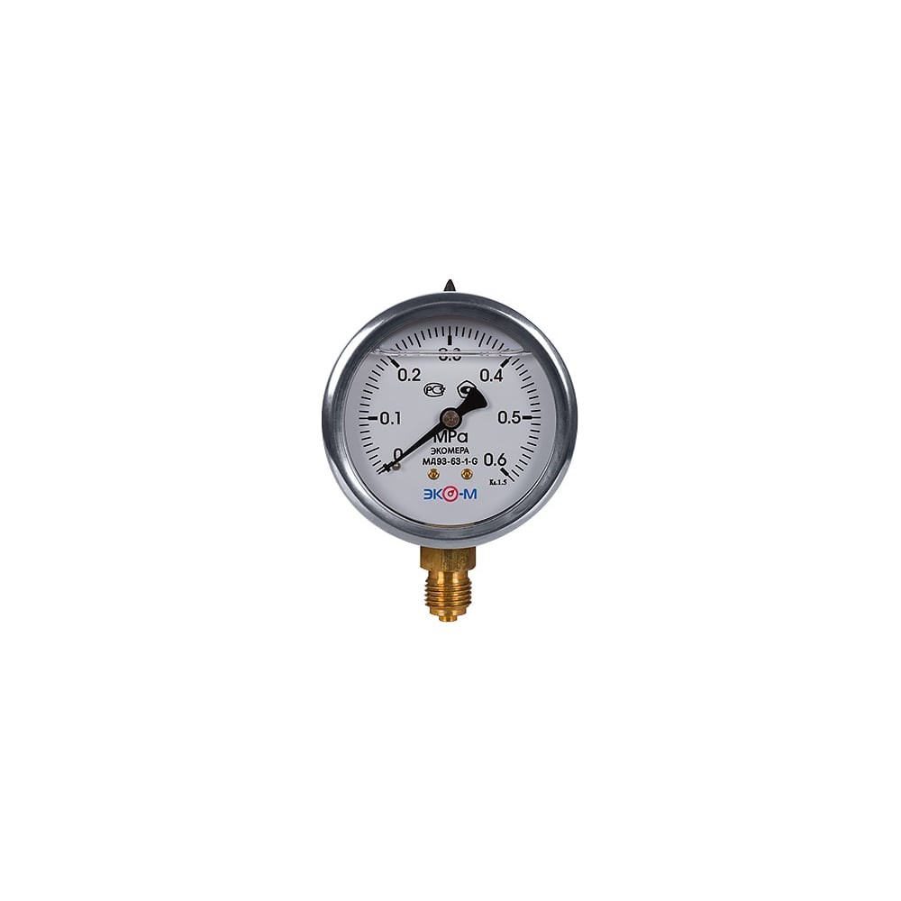 Манометр ЭКО-М Экомера МД93-63мм 0..0,6 МПа G1\4 (Гидрозаполненный) МД93-63-G-0,6МПа для измерения давления газообразных и жидких, не сильно вязких и кристаллизующихся сред, не агрессивных по отношению к медным сплавам (вода, пар, газ, масло, керосин, бензин, дизельное топливо) в местах с повышенной вибрацией и пульсацией. Межповерочный интервал 2 года.