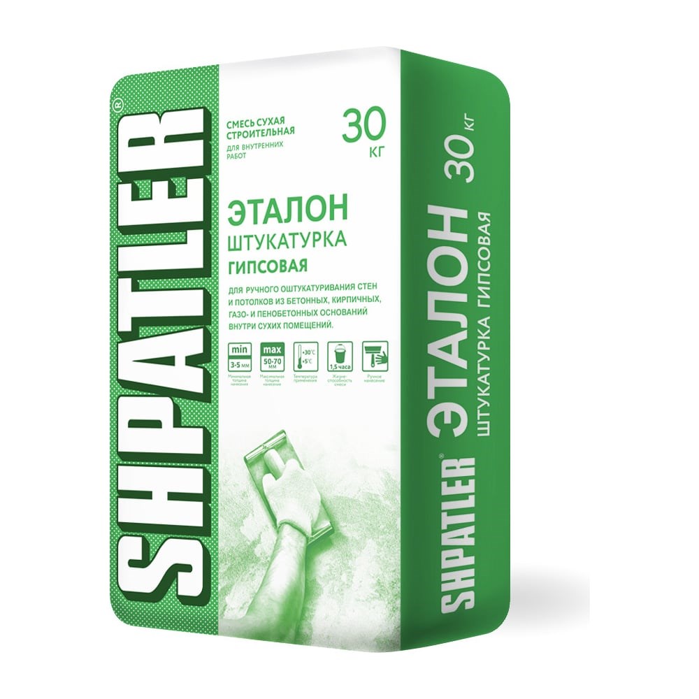 Гипсовая штукатурка ШПАТЛЕР Эталон 30 кг Ш00044 предназначена для ручного оштукатуривания стен и потолков из бетонных, кирпичных, газо- и пенобетонных оснований внутри сухих помещений. Описание Сухая смесь на гипсовой основе с добавлением легкого наполнителя, модифицированная минеральными и полимерными добавками. При смешивании с водой образует пластичную растворную смесь, удобную для нанесения и последующего заглаживания. Рекомендуется для ручного нанесения. Температура применения +(5÷30) °С Расход сухой смеси на 10 мм слоя 8-9 кг/м2 Расход воды при ручном нанесении, 0,48-0,5 л/кг Наибольшая крупность зёрен заполнителя 1,25 мм Подвижность растворной смеси Пк3 Минимальная толщина слоя: -по бетону, железобетону -по кирпичу 5 мм 5 мм Максимальная толщина слоя: -по бетону, железобетону -по кирпичу 40 мм 50 мм Время использования готовой растворной смеси не менее 1 ч Марочная прочность М25 Удельная эффективная активность естественных радионуклидов Аэфф не более 370 Бк/кг