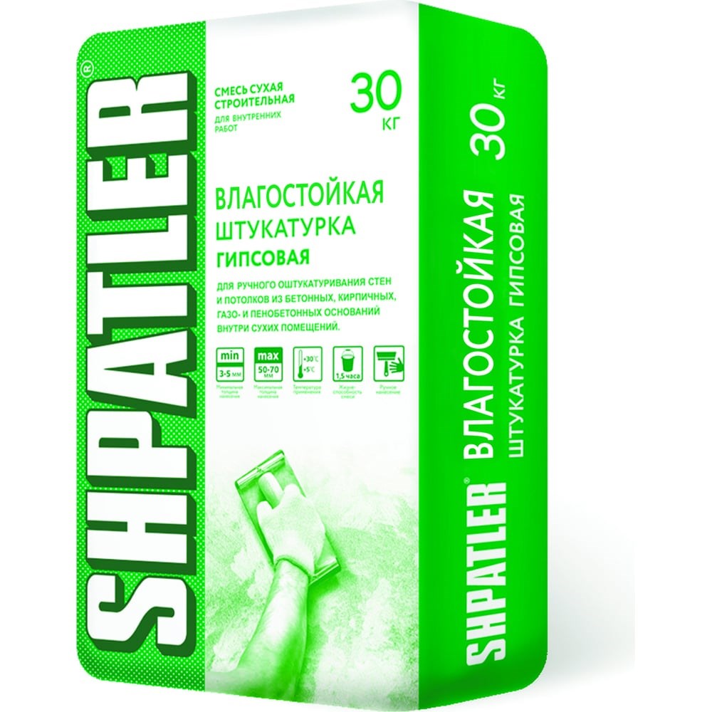 Гипсовая влагостойкая штукатурка ШПАТЛЕР 30 кг Ш00047 предназначена для ручного и механизированного оштукатуривания стен и потолков из бетонных, кирпичных, газо- и пенобетонных оснований внутри сухих и влажных помещений. Глянцуется - может окрашиваться без дополнительного шпатлевания. Описание продукта Сухая смесь на основе смешанного вяжущего с добавлением легкого наполнителя, модифицированная минеральными и функциональными добавками. При смешивании с водой образует пластичную растворную смесь, удобную для нанесения и последующего заглаживания. Рекомендуется для ручного и машинного нанесения.