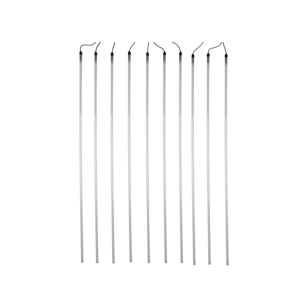Гирлянда Neon-Night тающие сосульки 24В, комплект 10шт х 100см, шаг 100см, 960led белый 256-429 - это оригинальное, красивое и современное средство оформления фасадов и интерьеров зданий, деревьев, витрин и т.д. Она представляет собой комплект из 10 прозрачных пластиковых трубок, расположенных на расстоянии 100 см друг от друга. По всей длине каждой трубки внутри надежно закреплена плата со светодиодами и микрочипом, обеспечивающим динамику с эффектом стекающей капли. Длина каждой трубки 100 см. Гирлянда работает от напряжения 24V, трансформатор идет в комплекте.