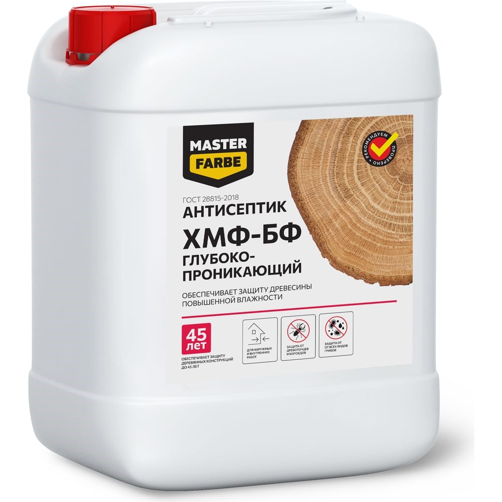 Глубокопроникающий антисептик для защиты древесины повышенной влажности MASTERFARBE ХМФ-БФ 10 кг 4631159427323 предназначен для защиты деревянных строительных конструкций от биологического разрушения (грибов гниения, синевы, плесени, поражения насекомыми древоточцами) при контакте с грунтом, атмосферными осадками внутри и снаружи помещений. Может использоваться как антисептический грунт перед окрашиванием укрывающими лакокрасочными материалами. После высыхания безопасен для людей и животных.Преимущества:Обеспечивает защиту деревянных конструкций до 45 лет ГОСТ 20022.0-2016Глубоко проникает во влажную древесинуДвойная защита от почвенных, домовых грибов гнили и плесениТрудновымываемый – ГОСТ2-80Химически связывается с древесинойНе создает поверхностной пленки и не нарушает воздухообменСохраняет свойства и структуру древесиныЯвляется малоопасным веществом (IV класс опасности), не горюч и взрывобезопасен
